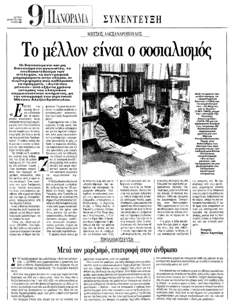 Στο φύλλο των «Νέων» που είχε κυκλοφορήσει τη Δευτέρα 28 Μαρτίου 1994 περιλαμβανόταν μια συνέντευξη που είχε παραχωρήσει ο Αλεξανδρόπουλος στη δημοσιογράφο – βιβλιοκριτικό Μικέλα Χαρτουλάρη, με αφορμή την κυκλοφορία του προαναφερθέντος μυθιστορήματος. Προβαίνοντας σε «μια ψυχογραφία του ελληνικού αριστερού κινήματος», ο «αιρετικός» συγγραφέας είχε δηλώσει, μεταξύ άλλων, τα εξής: