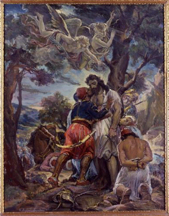 *Στην κεντρική φωτογραφία του παρόντος άρθρου, «Το Φίλημα»: ο Ιμπραήμ ασπάζεται τον νεκρό Παπαφλέσσα σε ένδειξη σεβασμού μετά τη μάχη στο Μανιάκι (ελαιογραφία σε μουσαμά του Ανδρέα Γεωργιάδη, 1960, Εθνικό Ιστορικό Μουσείο).