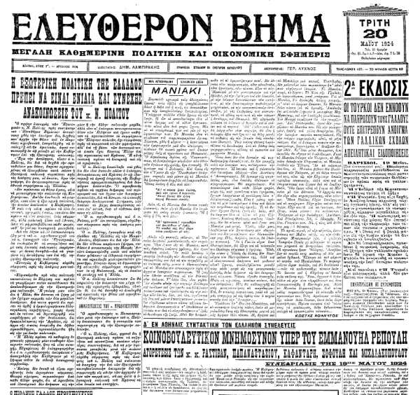 «ΕΛΕΥΘΕΡΟΝ ΒΗΜΑ», 20.5.1924, Ιστορικό Αρχείο «ΤΟ ΒΗΜΑ» & «ΤΑ ΝΕΑ»