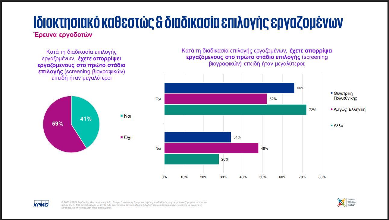 Οι αμιγώς ελληνικές εταιρείες φαίνεται να είναι πιο επιρρεπείς στον «αόρατο» ηλικιακό ρατσισμό. Ο ένας στους δύο εργοδότες σε ελληνικές επιχειρήσεις έχει απορρίψει εργαζόμενο στο πρώτο στάδιο επιλογής, δηλαδή στο screening βιογραφικών, έναντι 34% στις πολυεθνικές. Ως κύρια αιτία απόρριψης αναφέρεται ότι υπάρχει κατεύθυνση από τη διοίκηση για πρόσληψη ατόμων νεότερης ηλικίας.