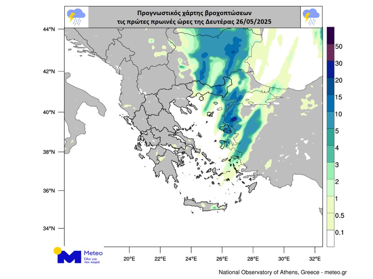 δ. Στην ανατολική Μακεδονία, τη Θράκη και το βορειοανατολικό Αιγαίο από νωρίς το βράδυ μέχρι τις πρώτες πρωινές ώρες της Δευτέρας (26-5-2025).