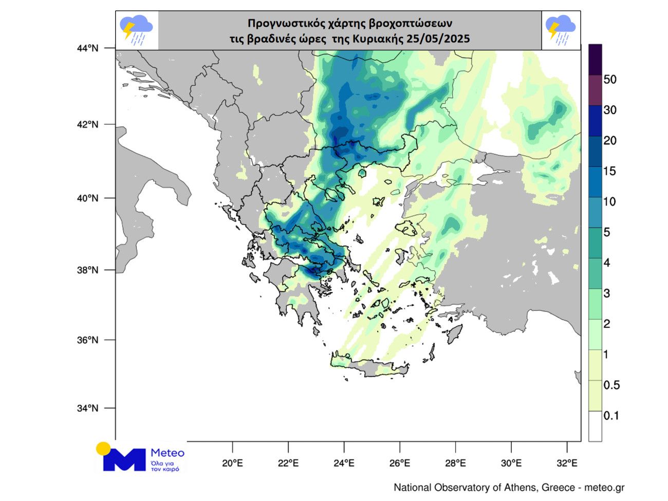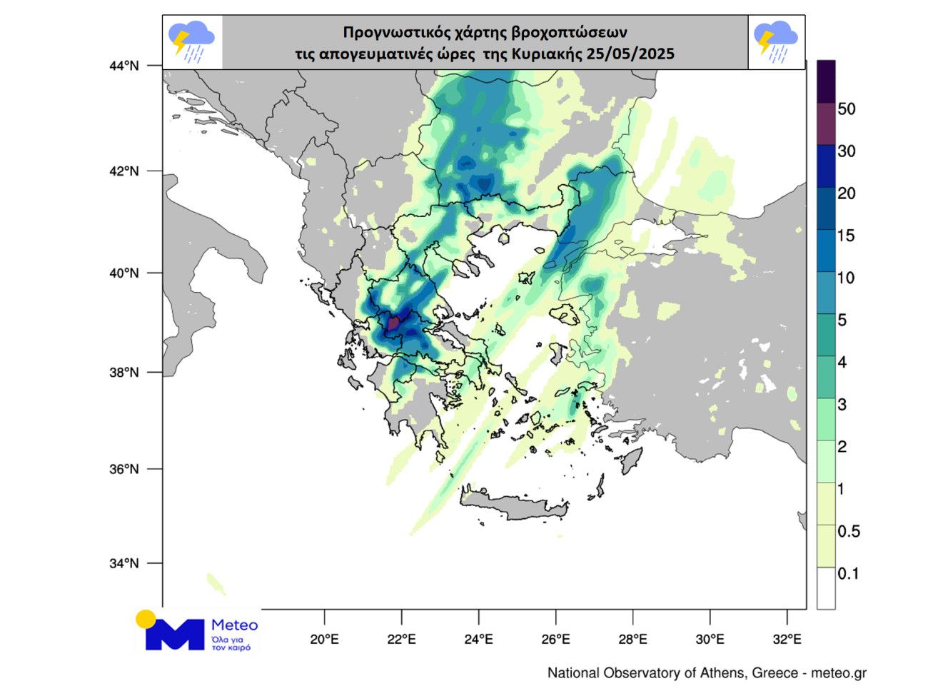 Σύμφωνα με τα προγνωστικά στοιχεία του meteo.gr / Εθνικού Αστεροσκοπείου Αθηνών, τοπικά ισχυρές βροχές και καταιγίδες αναμένονται από τις μεσημεριανές ώρες της Κυριακής 25/05 στη Στερεά Ελλάδα, τη Βορειοανατολική Πελοπόννησο, τη Θεσσαλία, την Εύβοια, την Κεντρική και Ανατολική Μακεδονία και τις βραδινές ώρες στις Σποράδες, τη Θράκη στο Βόρειο Αιγαίο και σταδιακά στο Ανατολικό Αιγαίο, φαινόμενα που θα εξασθενήσουν τις πρωινές ώρες της Δευτέρας 26/05.