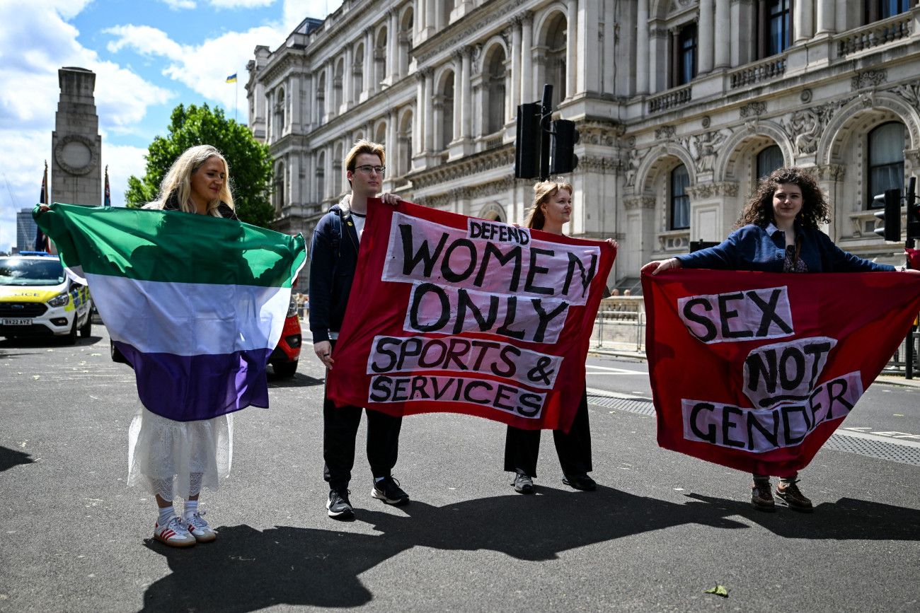 Διαδηλωτές της εκστρατείας STRIVE πραγματοποιούν γυμνόστηθη διαδήλωση έξω από την Downing Street μετά από πορεία για τα δικαιώματα των τρανς μετά την απόφαση του Ανώτατου Δικαστηρίου τον Απρίλιο ότι μόνο οι βιολογικές γυναίκες αναγνωρίζονται σύμφωνα με τον νόμο περί ισότητας της Βρετανίας.