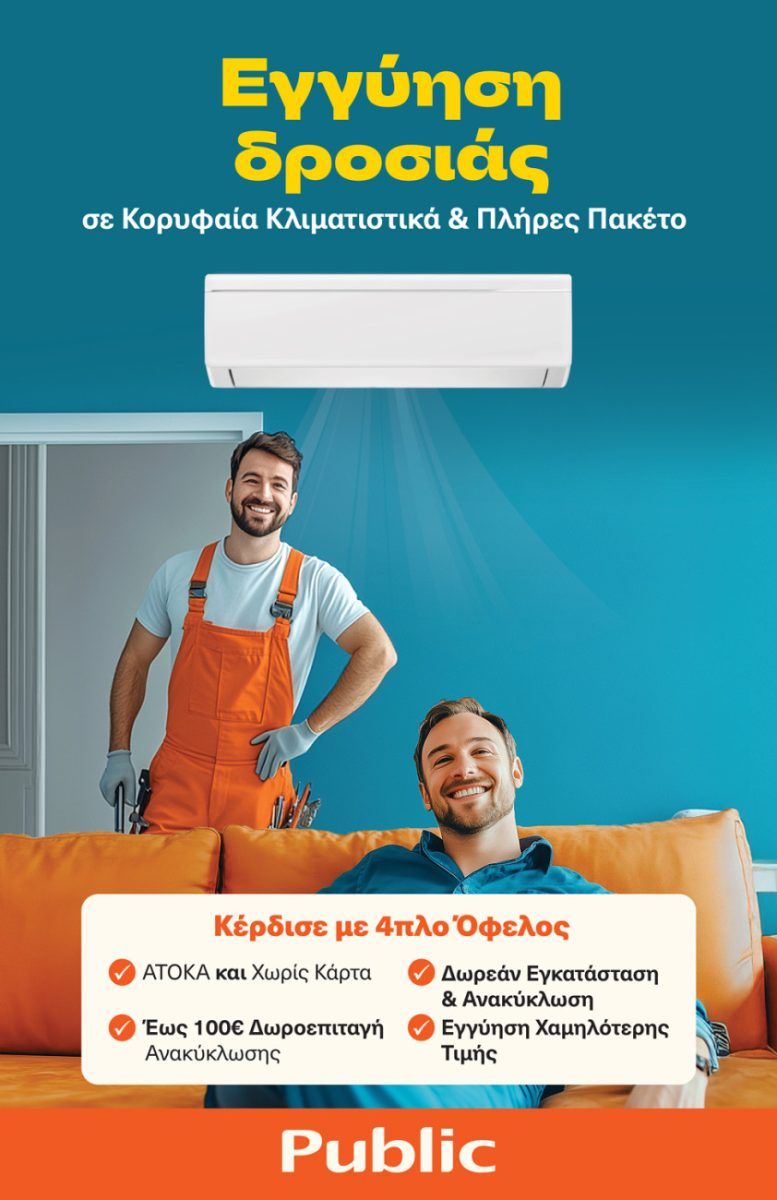Και τέλος, τα Public προσφέρουν Εγγύηση Χαμηλότερης Τιμής. Αυτό σημαίνει ότι αν βρείτε το ίδιο μοντέλο κλιματιστικού φθηνότερα σε άλλο κατάστημα Public ή σε άλλη οργανωμένη αλυσίδα εντός δύο εβδομάδων από την αγορά, θα σας επιστραφεί άμεσα η διαφορά στο Public Wallet.