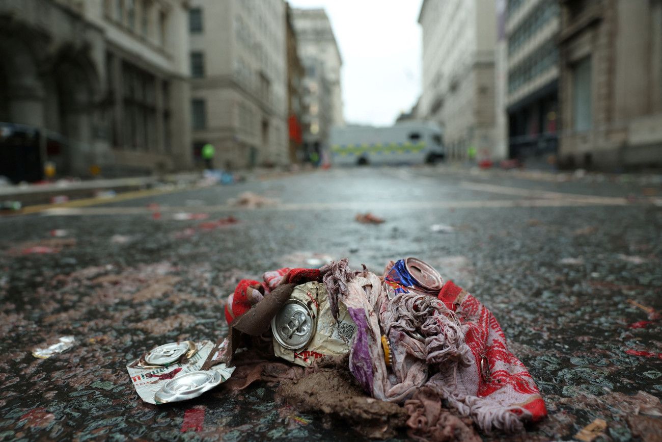 Ομάδες οδοκαθαρισμού εργάστηκαν κατά τη διάρκεια της νύχτας για να καθαρίσουν τον δρόμο, ο οποίος ήταν γεμάτος με μπουκάλια, κουτιά και κασκόλ και σημαίες ποδοσφαίρου.