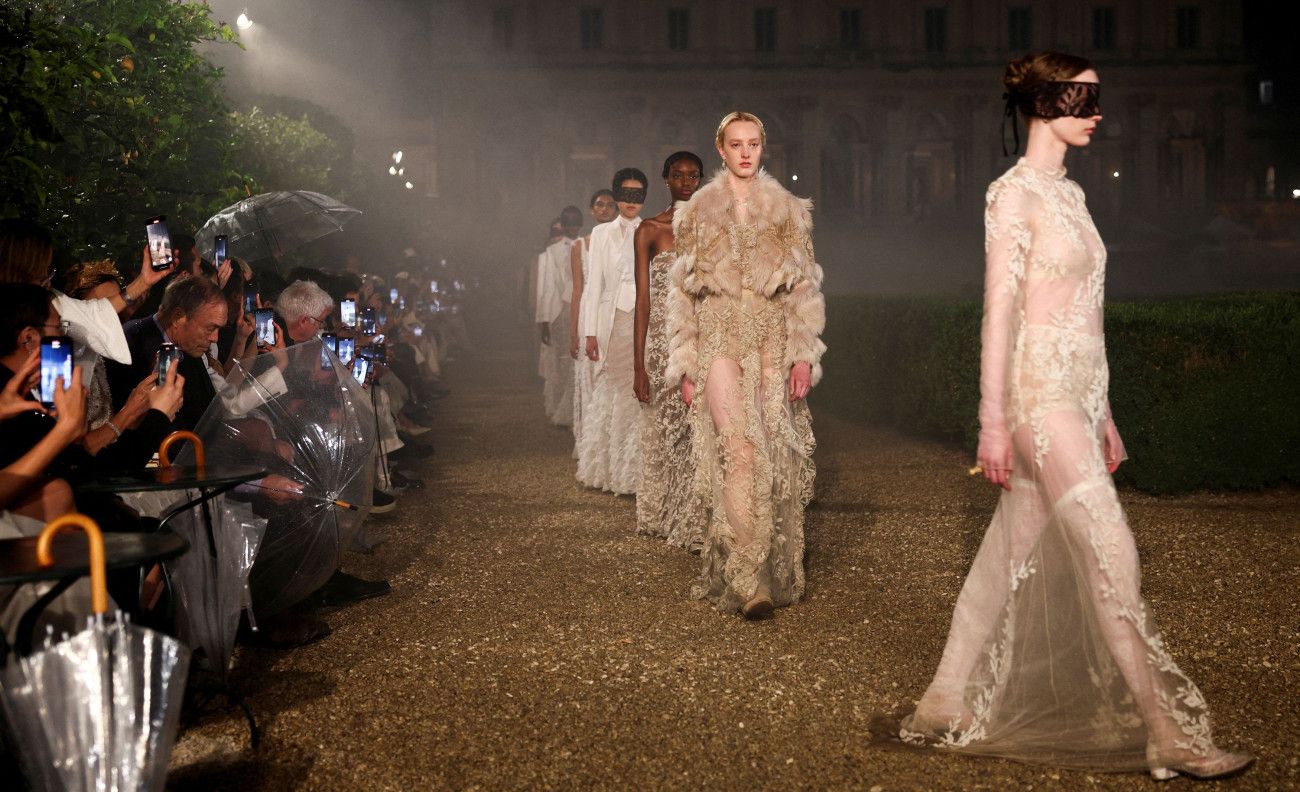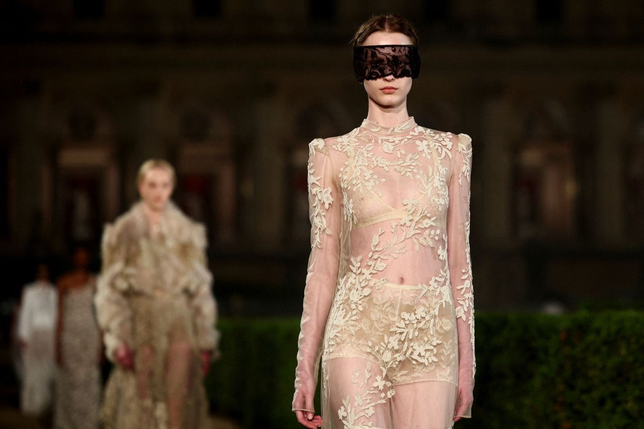 Κάθε μοντέλο έφερνε το δράμα: ένα κοστούμι φράκο με μικροσκοπικά μεταξωτά κουμπιά από ελεφαντόδοντο, ασημένια πλέγματα που ταίριαζαν σε πριγκίπισσες της Αναγέννησης, ημιδιαφανή κλασικά φορέματα που έμοιαζαν με μαρμάρινες θεές που ζωντάνεψαν, λειτουργική μεγαλοπρέπεια με κάπες και γιακάδες που παραπέμπουν στο Βατικανό.