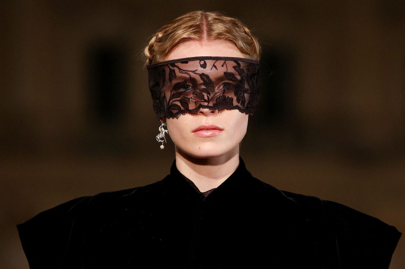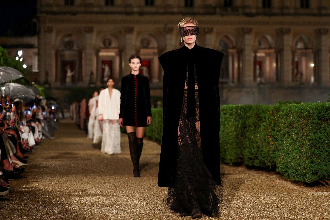 Υπήρχε όμως και ένας αναπόφευκτος υπαινιγμός για το ερώτημα του δικού της μέλλοντος στον Dior. Ακόμη και πριν ανοίξει το σόου, οπερατικά κωδικοποιημένο με μοντέλα με βενετσιάνικες μάσκες και μάσκες τα μάτια από δαντέλα αλά Eyes Wide Shut να παρελαύνουν το σούρουπο στο κεντρικό παρτέρι μιας βίλας γεμάτης με ρωμαϊκές αρχαιότητες, η βραδιά φούντωνε από ίντριγκα.