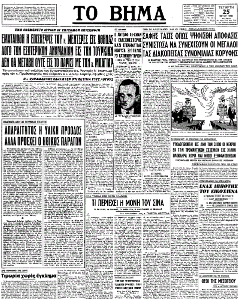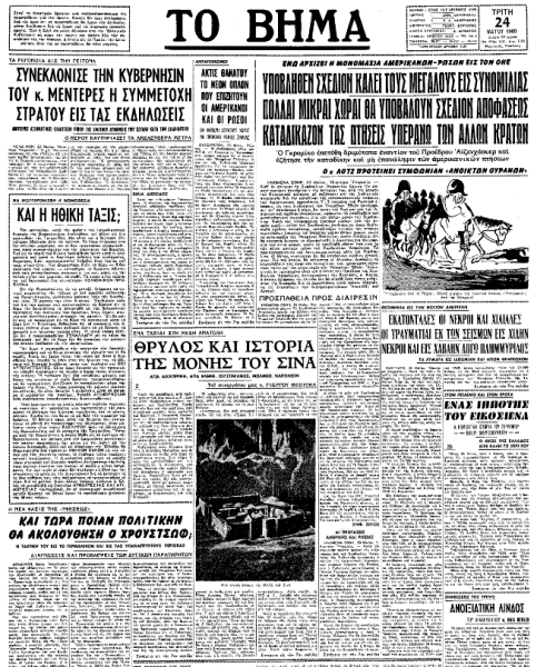 *Αποσπάσματα από κείμενα-ταξιδιωτικές εντυπώσεις του Γιώργου Θεοτοκά, που ήταν αφιερωμένα στη μονή Αγίας Αικατερίνης Σινά και είχαν δημοσιευτεί στην εφημερίδα «Το Βήμα» την Τρίτη 24 Μαΐου και την Τετάρτη 25 Μαΐου 1960, υπό τον τίτλο «Θρύλος και ιστορία της Μονής του Σινά» και «Τι περιέχει η Μονή του Σινά» αντιστοίχως.