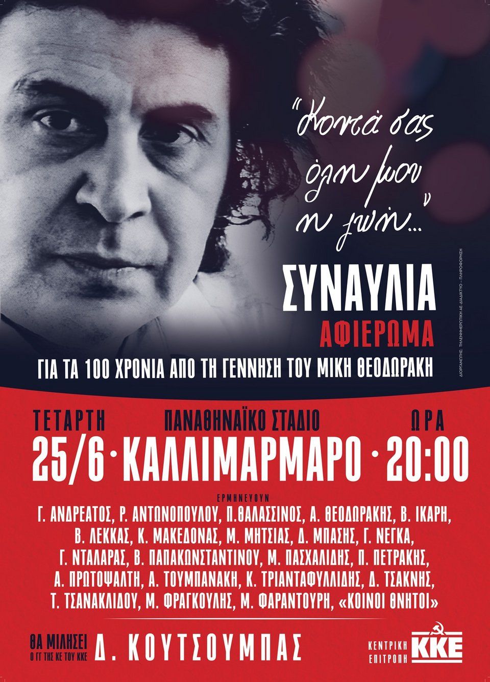 Τη συναυλία διοργανώνουν η Κεντρική Επιτροπή του ΚΚΕ και η οικογένεια του Μίκη Θεοδωράκη, τιμώντας τη συμπλήρωση 100 χρόνων από τη γέννησή του. Για το έργο, την προσφορά και τους αγώνες του αείμνηστου συνθέτη θα μιλήσει ο Γενικός Γραμματέας της Κεντρικής Επιτροπής του Κομμουνιστικού Κόμματος Ελλάδας, Δημήτρης Κουτσούμπας.
