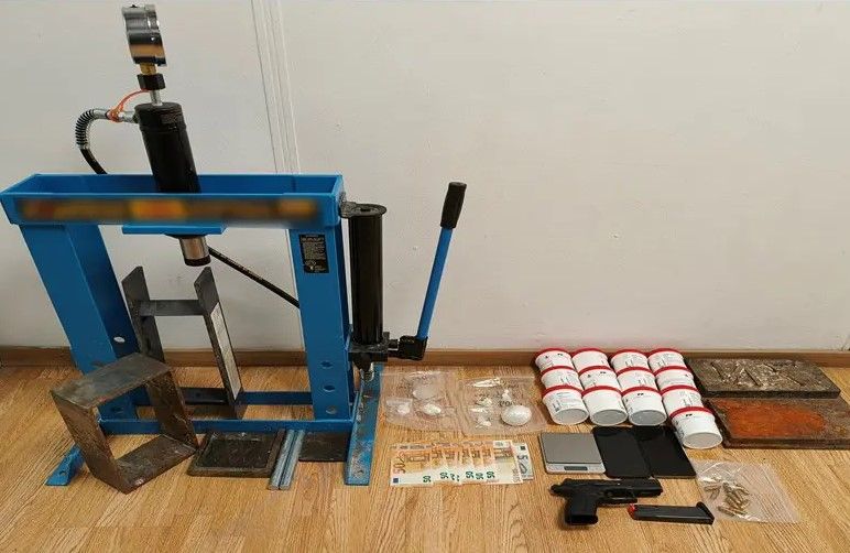 Κατασχέθηκαν μεταξύ άλλων 84,2 γραμμάρια κοκαΐνης, 2.600 γραμμάρια βορικού οξέος, υδραυλική πρέσα, πιστόλι και 505 ευρώ