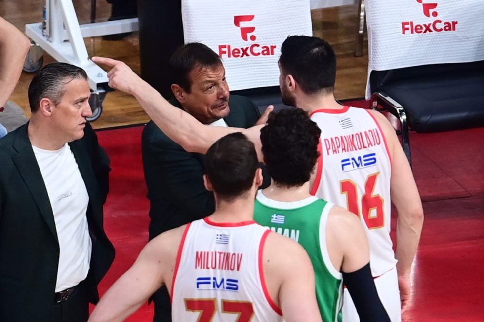 Ένταση ανάμεσα στον Κώστα Παπανικολάου και τον Εργκίν Αταμάν στο πέμπτο λεπτό του δεύτερου τελικού της Greek Basketball League ανάμεσα σε Ολυμπιακό και Παναθηναϊκό.