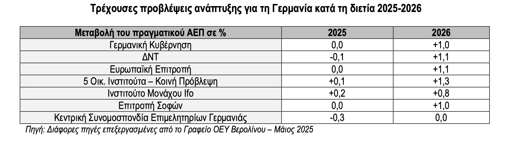 Παράλληλα, το ΔΝΤ προβλέπει οριακή ύφεση (-0,1%) εφέτος και ανάπτυξη 1,1% το 2026, η κοινοί πρόβλεψη των 5 οικονομικών ινστιτούτων αναμένει οριακή μεταβολή εφέτος (+0,1%) και ρυθμό αύξησης του ΑΕΠ 1,3% το 2026, ενώ το ινστιτούτο Ifo του Μονάχου +0,2% και +0,8% αντίστοιχα. Η κεντρική συνομοσπονδία επιμελητηρίων Γερμανίας από την άλλη πλευρά προβλέπει ύφεση 0,3% εφέτος και μηδενική ανάπτυξη το 2026.
