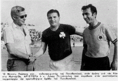 Στην κεντρική φωτογραφία του παρόντος άρθρου, ο Φέρεντς Πούσκας μαζί με τον κορυφαίο του ελληνικού ποδοσφαίρου, τον Μίμη Δομάζο.