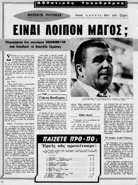 Είναι λοιπόν μάγος ο Πούσκας; Ο Μαγυάρος αυτός άσσος, που συγκλόνισε κάποτε με την ταξιαρχία του το παγκόσμιο ποδόσφαιρο, που έστησε το λάβαρο του 6-3 μέσα στο Γουέμπλεϋ με την Εθνική Ουγγαρίας εναντίον των Άγγλων, που δόξασε την Ρεάλ Μαδρίτης, που έφθασε τον Παναθηναϊκό στους ημιτελικούς του Κυπέλλου Ευρώπης. Οι παίκτες του, οι άξιοι πρωταθληταί Ελλάδος, που πριν από λίγες ημέρες έστησαν τον μεγάλο θρίαμβο αποκλείοντας την Έβερτον, οι βοηθοί του, όλοι οι άνθρωποι που βρίσκονται στο άμεσο περιβάλλον του, αναγνωρίζουν πράγματι στον άνθρωπο αυτόν μια ξεχωριστή φλόγα, μια ιδιαίτερη ικανότητα, ένα είδος μαγνητισμού θα μπορούσε να πη κανείς.