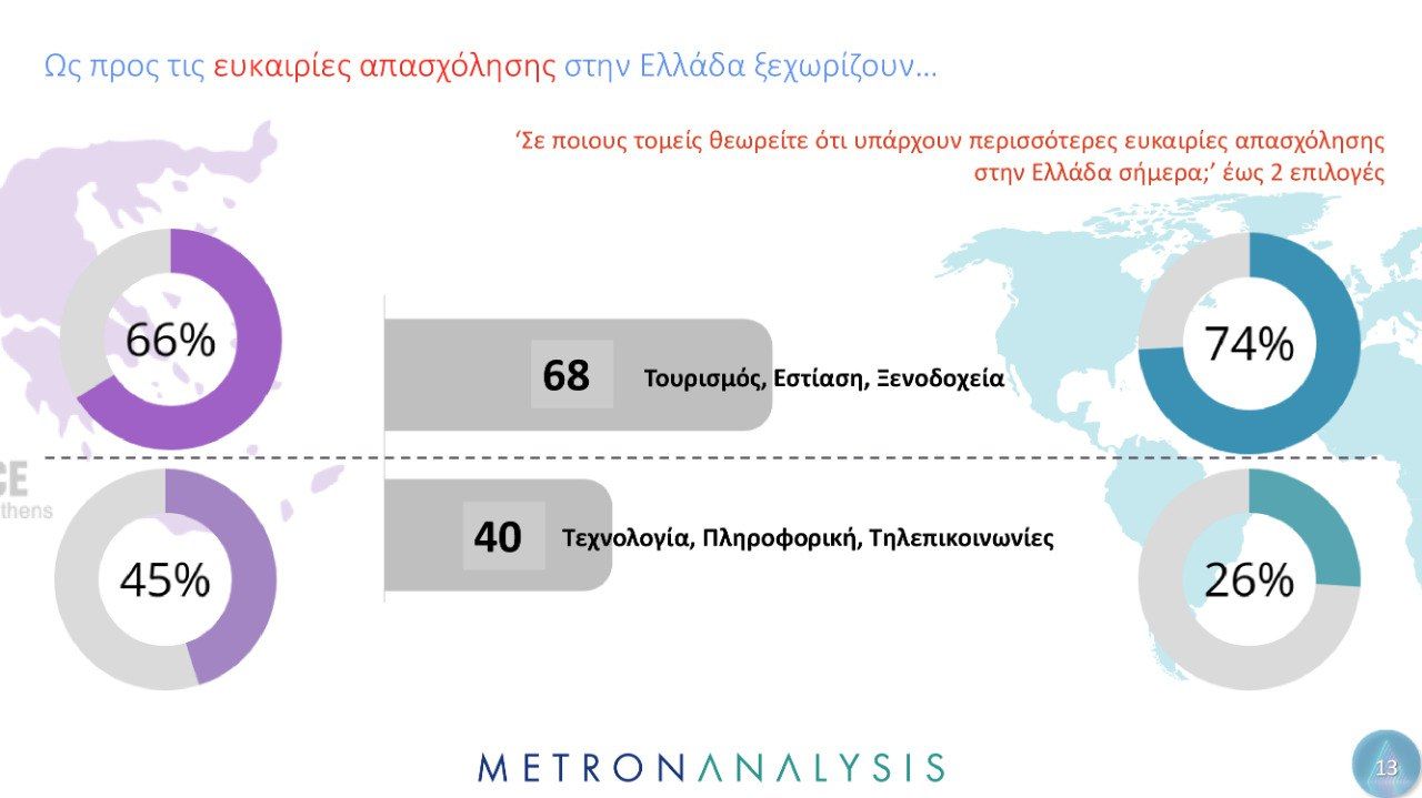 Αναφορικά δε με τους τομείς που δίνουν περισσότερες ευκαιρίες απασχόλησης στην Ελλάδα, πρωταθλητής αναδεικνύεται ο τουρισμός.