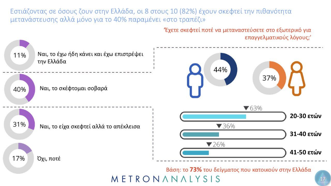 Ενδεικτικό της τάσης φυγής που συνεχίζει να υπάρχει και μετά την κρίση στην Ελλάδα είναι ότι 8 στους 10 έχουν σκεφτεί την πιθανότητα να μεταναστεύσει στο εξωτερικό. Από αυτούς για ένα 40% η πιθανότητα μετανάστευσης παραμένει στο τραπέζι.