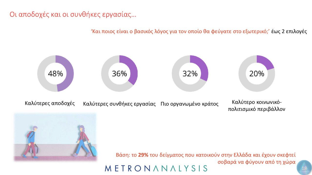 Στην ερώτηση «κλειδί» της έρευνας για το ποιος είναι ο βασικός λόγος που θα οδηγούσε κάποιον να μεταναστεύσει η συντριπτική πλειοψηφία αναφέρει την αναζήτηση καλύτερων αποδοχών και καλύτερων συνθηκών εργασίας.