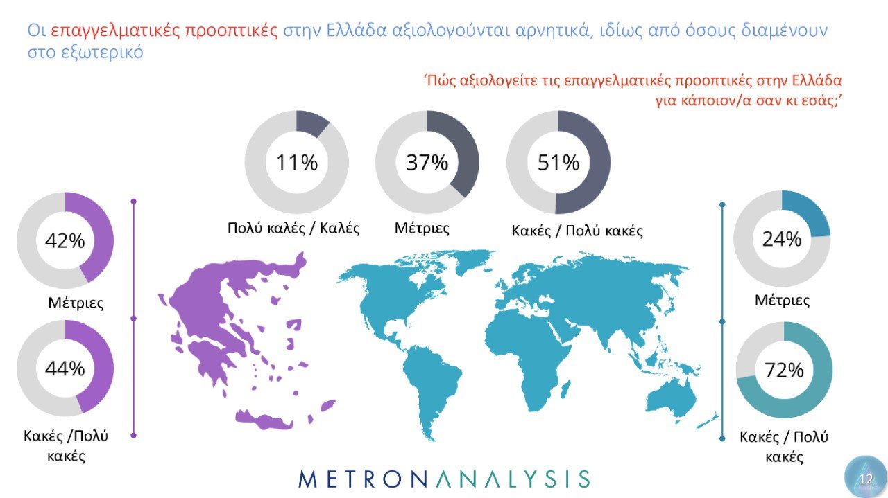 Σχεδόν 9 στους 10 εντός της χώρας φαίνονται απογοητευμένοι ενώ το ποστοστό αυτό είναι ακόμα μεγαλύτερο για τους κατοίκους του εξωτερικού με το 72% να κρίνει ότι οι επαγγελματικές προοπτικές στην Ελλάδα είναι κακές και πολύ κακές.
