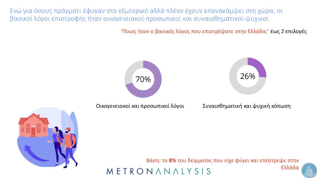 Χαρακτηριστικό είναι επίσης ότι αυτοί που επέστρεψαν στη χώρα δεν το έκαναν γιατί βρήκαν καλύτερες ή τις ίδιες ευκαιρίες εδώ, αλλά το έκαναν για οικογενειακούς και προσωπικούς λόγους ή ακόμα εξαιτίας της συναισθηματικής και ψυχικής κόπωσης.