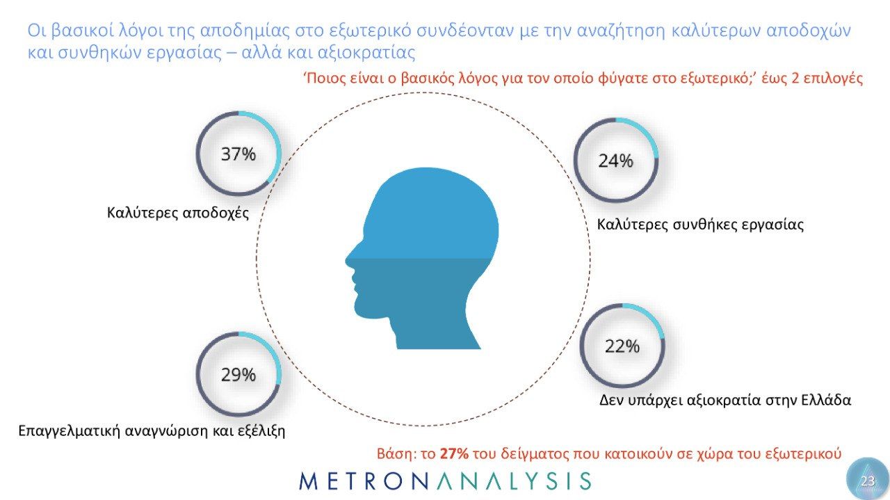 Ανάμεσα στους ερωτηθέντες που μένουν στο εξωτερικό, οι καλύτερες αποδοχές είναι ο «νούμερο ένα» λόγος που τους έκανε να μεταναστεύσουν. Ακολουθούν οι καλύτερες συνθήκες εργασίας, η ανάγκη επαγγελματική αναγνώρισης και εξέλιξης αλλά και το έλλειμμα αξιοκρατίας στην Ελλάδα.