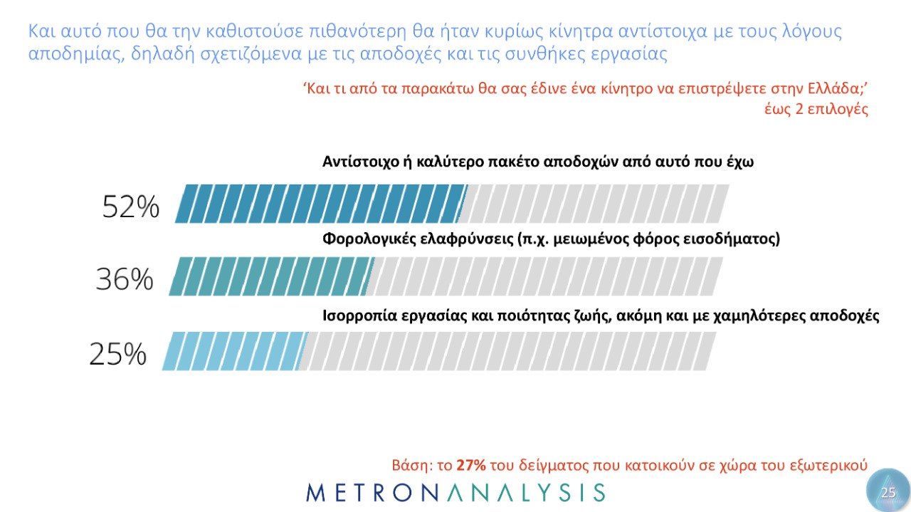 Αναφορικά με το τι θα λειτουργούσε ως κίνητρο για επιστροφή στην Ελλάδα η πλειοψηφία απαντά και πάλι τις αποδοχές. Ένα 36% αναφέρει τις φορολογικές ελαφρύνσεις και ένα 25% την δυνατότητα ισορροπίας εργασίας και ποιότητας ζωής ακόμα και με χαμηλότερες αποδοχές.
