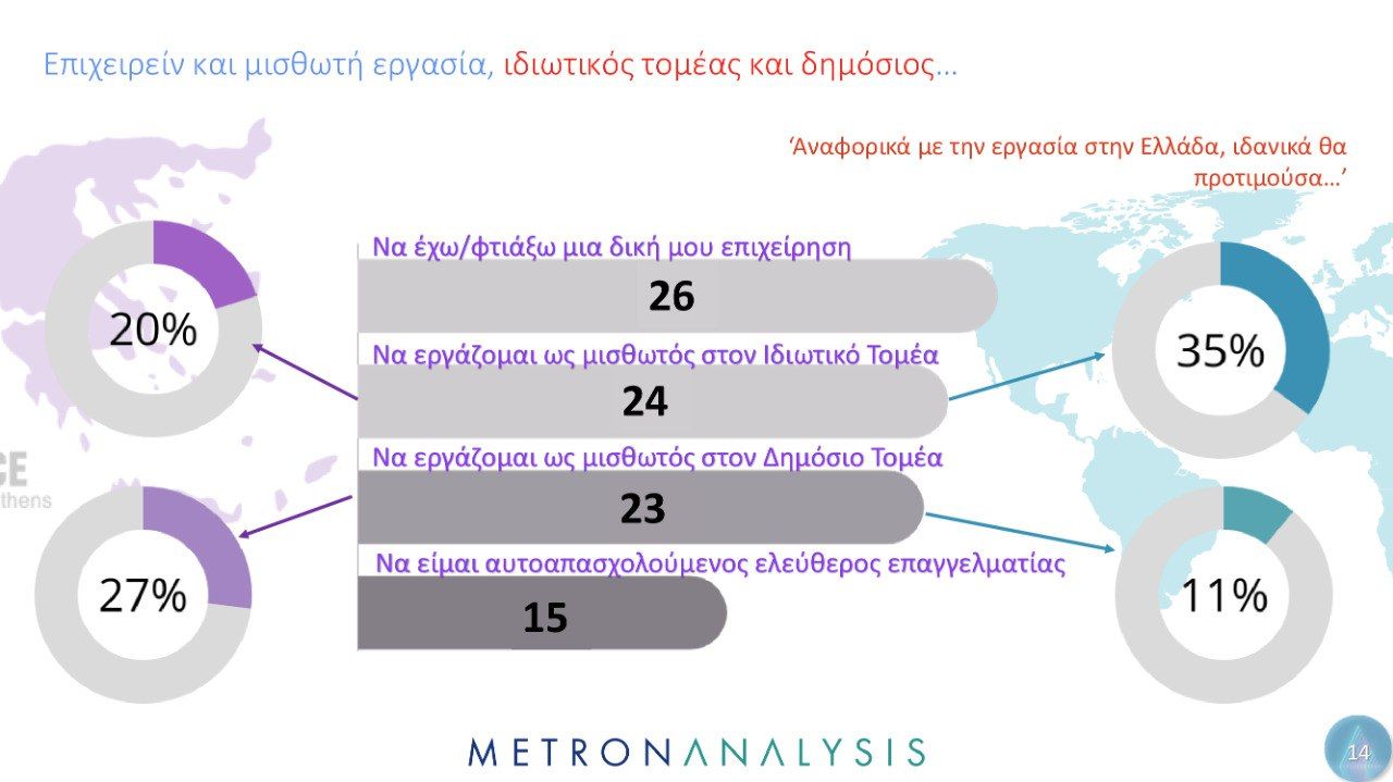 Η πλειοψηφία προτιμά το επιχειρείν από τη μισθωτή εργασία ενώ η απασχόληση στο δημόσιο είναι τελευταία επιλογή για τους Έλληνες του εξωτερικού. Μόνο ένα 20% των κατοίκων της Ελλάδας θα επέλεγε να εργαστεί στον ιδιωτικό τομέα και μόλις ένα 27% στο δημόσιο, γεγονός που αντανακλά τη μεταστροφή που έχει γίνει τα τελευταία 15 χρόνια στη χειροτέρευση των συνθηκών εργασίας των μισθωτών.