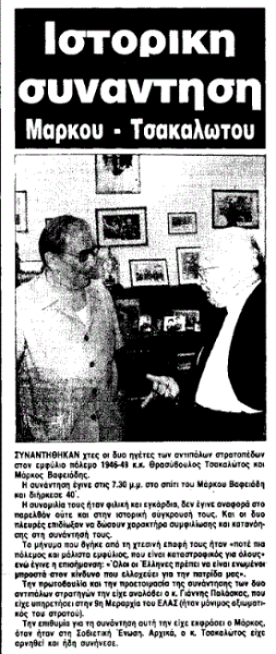 Στις 23 Μαΐου 1984, κατόπιν πρωτοβουλίας του Μακρή, είχε λάβει χώρα η συμφιλιωτική συνάντηση του Θρασύβουλου Τσακαλώτου και του Μάρκου Βαφειάδη (αυτή απεικονίζεται στην κεντρική φωτογραφία του παρόντος άρθρου), των ηγετών των δύο αντίπαλων στρατοπέδων στον Εμφύλιο.