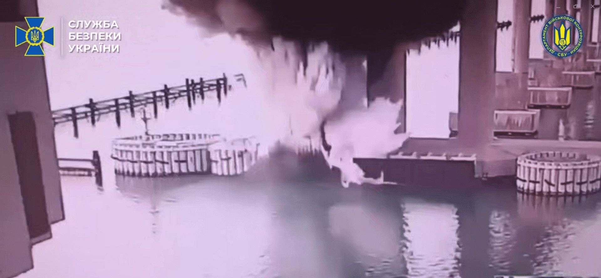Η SBU κοινοποίησε βίντεο που δείχνει μια έκρηξη δίπλα σε έναν από τους πολλούς πυλώνες στήριξης της γέφυρας.