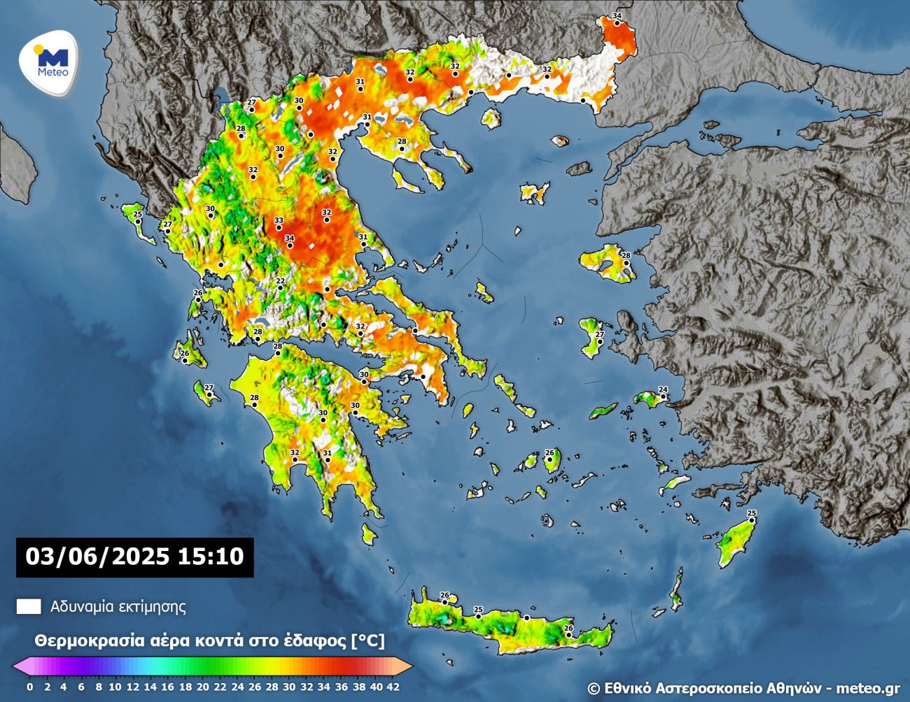 Το Meteo παρουσιάζει χάρτη με την εκτίμηση της θερμοκρασίας για τις 15:10 της Τρίτης (03/06/2025). Οι λίγες περιοχές για τις οποίες δεν ήταν δυνατή η εκτίμηση της θερμοκρασίας σημειώνονται με λευκό χρώμα. Προκειμένου να παρακολουθείτε τις εκτιμήσεις της θερμοκρασίας σε σχεδόν πραγματικό χρόνο, με ρυθμό ανανέωσης 30 λεπτών, έχει αναρτηθεί ο σύνδεσμος: Εκτίμηση της Θερμοκρασίας Αέρα με Τεχνητή Νοημοσύνη (AI).