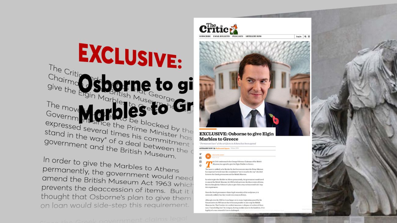 «Τα γλυπτά αποκτήθηκαν νόμιμα από τον λόρδο Έλγιν από τους Οθωμανούς το 1801, αγοράστηκαν από τη Βρετανία το 1816 και τώρα, φαίνεται, παραδίδονται στην ελληνική κυβέρνηση χωρίς κόστος. Τι πολιτικό κεφάλαιο! Ίσως απλώς ήταν πολύ μεγάλα για να χωρέσουν σε μία τσάντα» λέει χαρακτηριστικά ο βρετανικό δημοσίευμα.