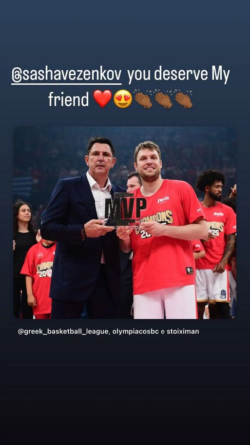 Ο Βραζιλιάνος θέλησε να πει συγχαρητήρια στον Σάσα Βεζένκοφ μέσω της ανάρτησης μια φωτογραφίας που ο Βούλγαρος φόργουορντ κρατάει το τρόπαιο του MVP και του έγραψε: «το αξίζεις φίλε μου». Αξίζει να σημειωθεί ότι τους δύο παίκτες του Ολυμπιακού συνδέει μια πολύ καλή φιλία.