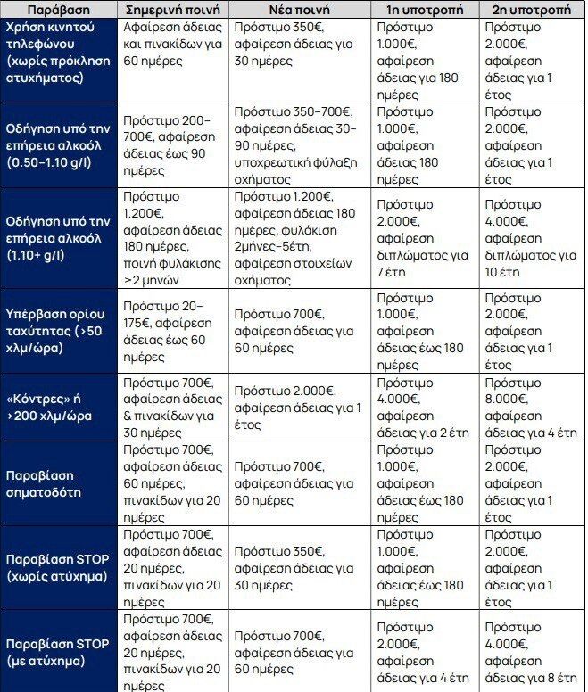 Ενδεικτικό παράδειγμά αυτής της νέας δομής ποινών αποτελεί η αντιμετώπιση της χρήσης κινητού τηλεφώνου, που το 2024 ήταν η 3η αιτία πρόκλησης τροχαίων στην Ελλάδα. Σήμερα, ανεξαρτήτως της πρόκλησης ατυχήματος, η χρήση κινητού επισύρει αφαίρεση άδειας οδήγησης και πινακίδων για 60 ημέρες.