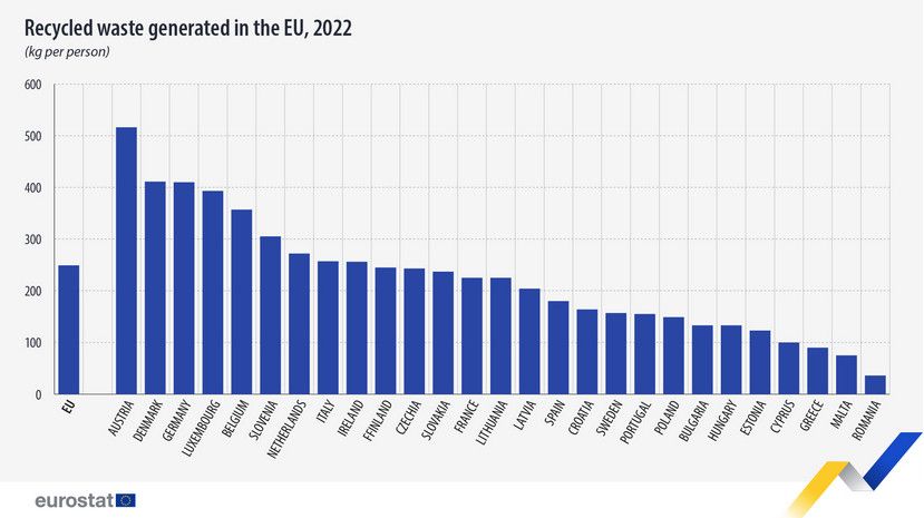 - Ενώ ο μέσος όρος ανακύκλωσης αποβλήτων της ΕΕ έχει φτάσει στο 49%, ο στόχος του 55% για τα αστικά απόβλητα έως το 2025 μοιάζει μακρινός