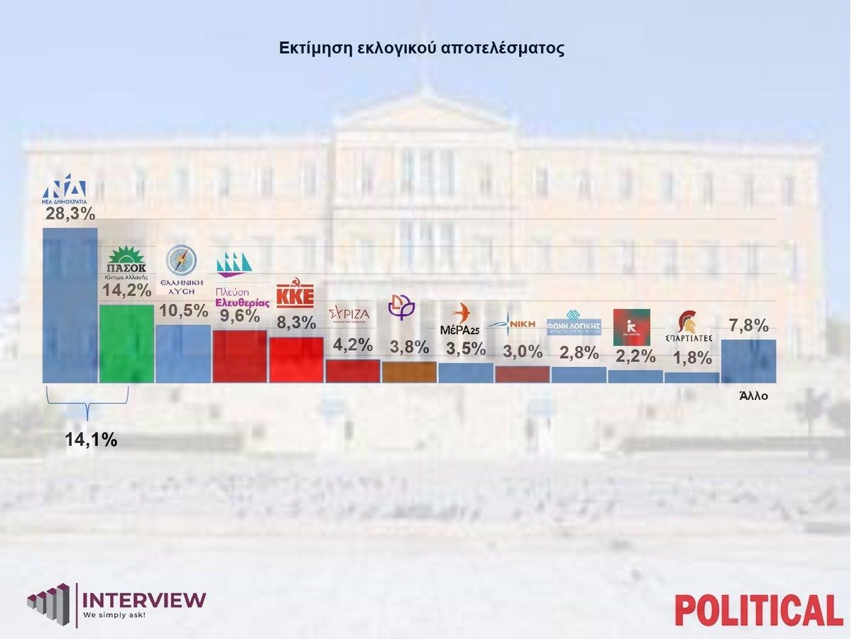 Η Νέα Δημοκρατία συγκεντρώνει ποσοστό 28,3% και την ακολουθεί το ΠΑΣΟΚ με 14,2%.