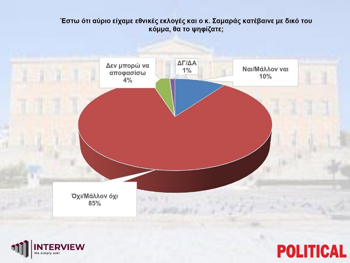 Σε περίπτωση που ο Αντώνης Σαμαράς έφτιαχνε κόμμα, τότε θα το ψήφιζε ένα 10%, ενώ στο 5% είναι οι αναποφάσιστοι. Το 85% απάντησε «Όχι» ή «Μάλλον όχι» αν θα το ψήφιζε.