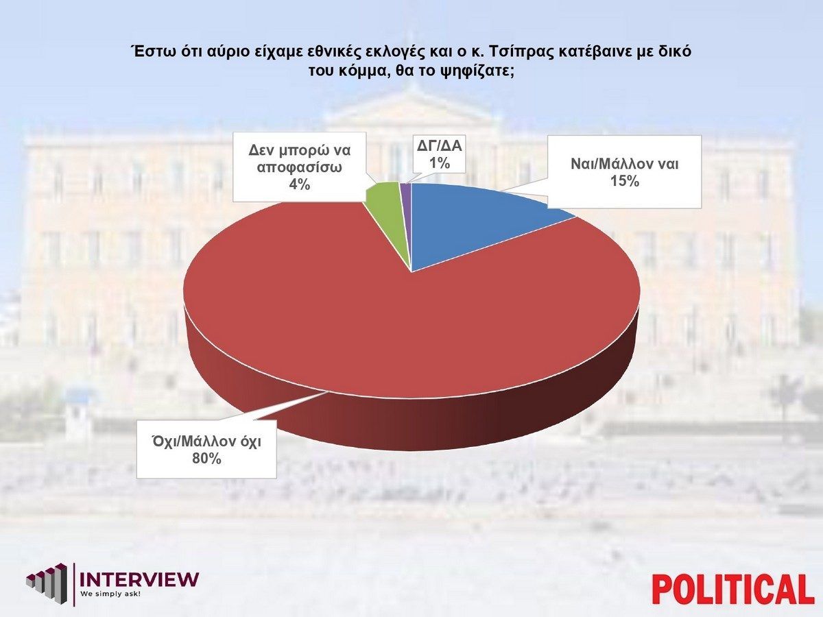 Όπως προαναφέρθηκε, τουλάχιστον ένα 15% θα ψήφιζε ένα κόμμα με αρχηγό τον Αλέξη Τσίπρα, ενώ 5% παραμένει αναποφάσιστο. Το 80% απάντησε «Όχι» ή «Μάλλον όχι» αν θα το ψήφιζε.