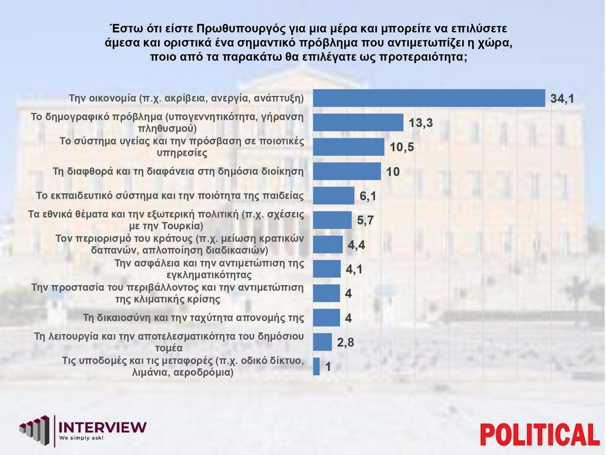 «Έστω ότι είστε Πρωθυπουργός για μια μέρα και μπορείτε να επιλύσετε άμεσα και οριστικά ένα σημαντικό πρόβλημα που αντιμετωπίζει η χώρα, ποιο από τα παρακάτω θα επιλέγατε ως προτεραιότητα», ήταν το ερώτημα που τέθηκε στους συμμετέχοντες στη δημοσκόπηση της Interview.