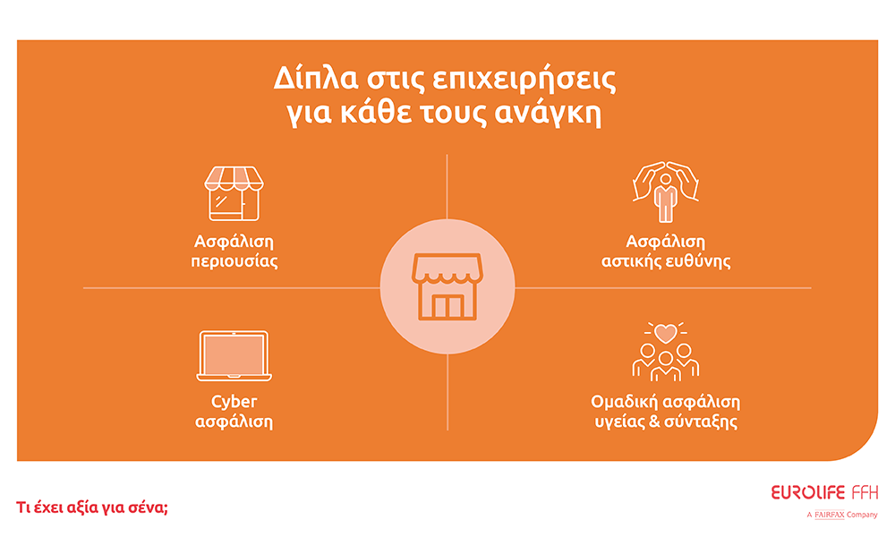 Ανεξαρτήτως μεγέθους ή κλάδου, η ασφάλιση μπορεί να βοηθήσει κάθε επιχείρηση να ανταπεξέλθει αποτελεσματικά στις προκλήσεις και να εξασφαλίσει τη συνέχεια της λειτουργίας της. Η Eurolife FFH βρίσκεται σταθερά στο πλευρό των επιχειρηματιών που την εμπιστεύονται, προκειμένου να μπορούν να βλέπουν το όραμά τους να αναπτύσσεται με ασφάλεια και σιγουριά.