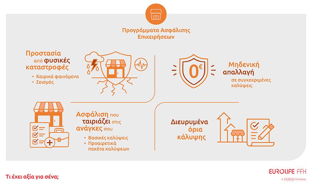 Η Eurolife FFH με το πρόγραμμα ασφάλισης My Business First, δίνει τη λύση στις επιχειρήσεις προκειμένου να προστατέψουν τα εταιρικά περιουσιακά στοιχεία από τις φυσικές καταστροφές που αναφέρθηκαν παραπάνω, όπως και από άλλα απρόοπτα περιστατικά, για παράδειγμα έκρηξη, κακόβουλη ενέργεια κ.α. Παρέχει κάλυψη αστικής ευθύνης, απώλειας κερδών, τεχνική βοήθεια και νομική προστασία, ενώ παράλληλα είναι ένα ευέλικτο πρόγραμμα που προσαρμόζεται ανάλογα με τις επιδιώξεις του ασφαλισμένου. Πιο συγκεκριμένα, το βασικό πακέτο παρέχει 14 καλύψεις και για ακόμη μεγαλύτερη προστασία, υπάρχουν 6 ακόμη διαθέσιμα πακέτα προαιρετικών καλύψεων.