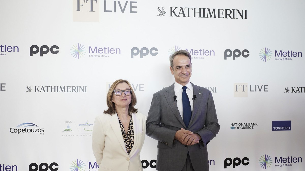 Ο πρωθυπουργός Κ.Μητσοτάκης δίπλα στην αρχισυντάκτρια των Financial Times για το κλίμα, Εμίλια Μίχασουκ (ΑΠΕ-ΜΠΕ)