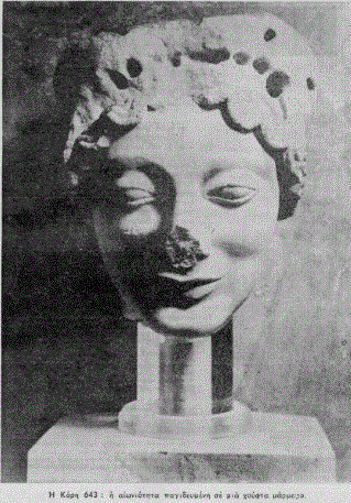 Μέσα στην απίθανα ποικίλη συλλογή των Κορών υπάρχει ένα μικρό κεφαλάκι, που μπορείς να το χουφτιάσης μέσα στο χέρι σου, το κεφάλι 643. Είναι ο πιο ώριμος καρπός της εκατοντάχρονης εξέλιξης του αρχαϊκού αυτού τύπου. Πώς θα μπορούσε να φανταστή κανείς πως μέσα σ’ ένα τόσο μικρό κομμάτι μάρμαρου —εξαίρετου λυχνίτη της Πάρου— θα μπορούσε να παγιδευτή η αιωνιότητα! Γιατί βέβαια δονεί τη χορδή της αιωνιότητας το πλήρες βίωμα μιας κορυφαίας στιγμής ψυχικής ευφορίας, έντονου βιταλισμού, ιλαρής πνευματικότητας και βαθυρρίζωτης ευγένειας ράτσας. Η ριγηλή δόνηση ολόκληρης της επιφάνειας του μοναδικού αυτού κεφαλιού οφείλεται στο μαϊστράλι ενός κρυφού μειδιάματος που προετοιμάζεται σε τρεις εστίες, γύρω από τ’ αμυγδαλωτά μάτια και γύρω από το στόμα με τον ανάλαφρο στραβισμό τών μόλις ανασυρμένων περιγραμμάτων των χειλιών. Η Τζοκόντα; Ω, βέβαια είναι ένα αριστούργημα. Αλλά ότι είναι ένα πληρέστερο αριστούργημα από την Κόρη 643 με την οποία συγγενεύει, επιτρέψτε μου ν’ αμφιβάλλω.