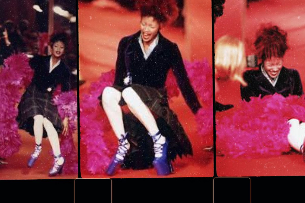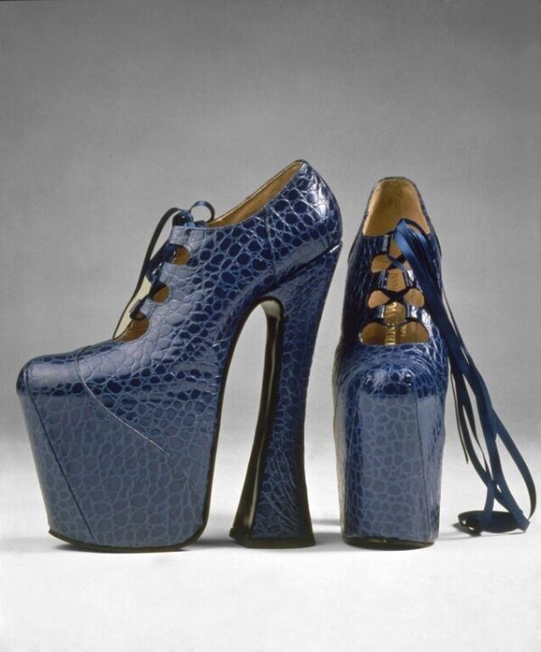 Παρίσι, Μάρτιος 1993. Η Ναόμι Κάμπελ περπατάει στο σόου Anglomania της Βίβιαν Γουέστγουντ. Η Κάμπελ ήταν 23 ετών όταν έπεσε, φορώντας ένα ζευγάρι από τις πλατφόρμες Super Elevated Ghillie της σχεδιάστριας, οι οποίες είχαν ύψος τακουνιού περίπου 21 εκατοστά (η μπράντα εξακολουθεί να πουλά ένα παρόμοιο ζευγάρι για 1.040 ευρώ).