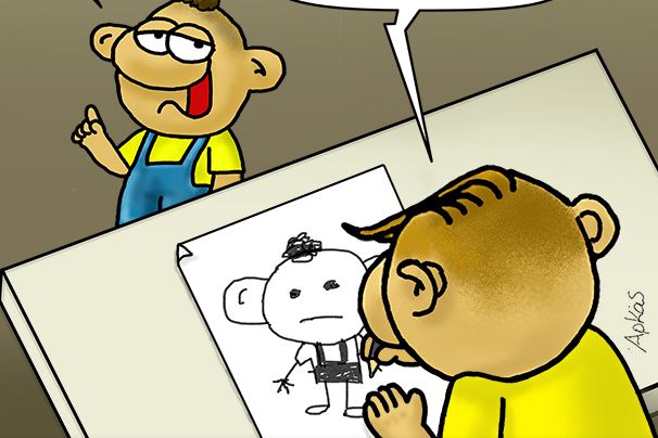 Ο Αρκάς στο σημερινό σκίτσο του μας παρουσιάζει τον μικρό να τον ζωγραφίζει ένας φίλος του και να του λέει συγκεκριμένα: «Φρόφιλ να με κάνεις για να μην φαίνονται μεγάλα τα αυτιά μου» και εκείνος να του απαντά: «Μην κουνιέθαι».