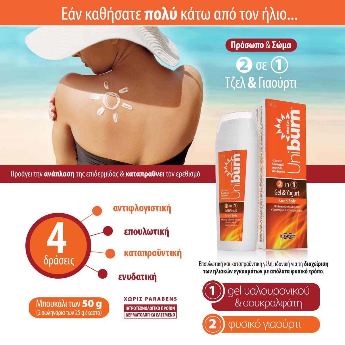 Με ειδική πατενταρισμένη σύνθεση που συνδυάζει gel υαλουρονικού οξέος και σουκραλφάτη και γιαούρτι, το Uniburn After Sun – κατάλληλο για πρόσωπο και σώμα – έχει ανάλαφρη, καθόλου λιπαρή υφή, υπέροχο άρωμα και ταιριάζει σε όλους τους τύπους επιδερμίδας. Η γέλη υαλουρονικού οξέος και σουκραλφάτης δημιουργεί ένα προστατευτικό φιλμ που ενυδατώνει σε βάθος την επιδερμίδα και επιταχύνει την ανάπλαση του δέρματος ενώ το γιαούρτι προσφέρει άμεση καταπραϋντική δράση και ανακούφιση από το κάψιμο και την κοκκινίλα.