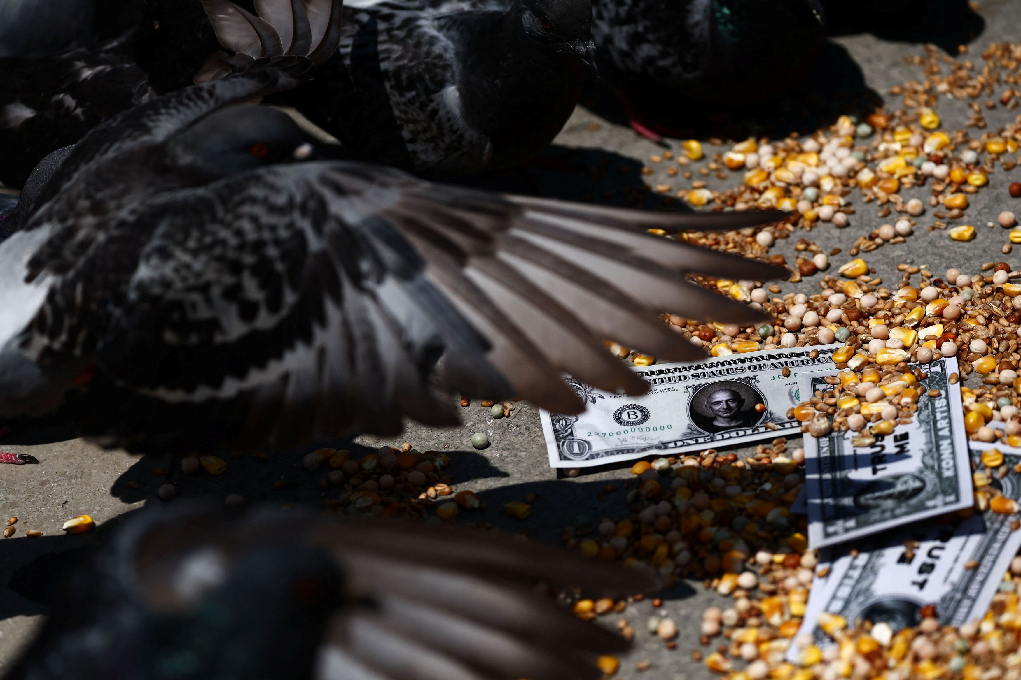 Περιστέρια τρώνε καλαμπόκι, ενώ ψεύτικα χαρτονομίσματα με το πρόσωπο του ιδρυτή της Amazon Τζεφ Μπέζος βρίσκονται στο δρόμο στην πλατεία του Αγίου Μάρκου πριν από τον αναμενόμενο γάμο του με την Λόρεν Σάντσεζ, στη Βενετία της Ιταλίας, 24 Ιουνίου 2025. REUTERS/Yara Nardi