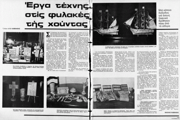 Μιλήσαμε με αρκετούς —μη καλλιτέχνες— δημιουργούς έργων τέχνης στα κάτεργα. Ανάμεσά τους ήταν ο σημερινός υπουργός Δημοσίων Έργων κ. Γεώργιος – Αλέξανδρος Μαγκάκης (σ.σ. μέλος της κυβέρνησης εθνικής ενότητας του Κωνσταντίνου Καραμανλή, από τις 26 Ιουλίου έως τις 9 Οκτωβρίου 1974). Στις φυλακές επεδόθη στην ξυλογλυπτική και τη σπιρτοτεχνία. Έτσι, ο καθηγητής της Νομικής έγινε κάτω από τις συνθήκες των φυλακών καλλιτέχνης. Να τι μας είπε σχετικά ο ίδιος: