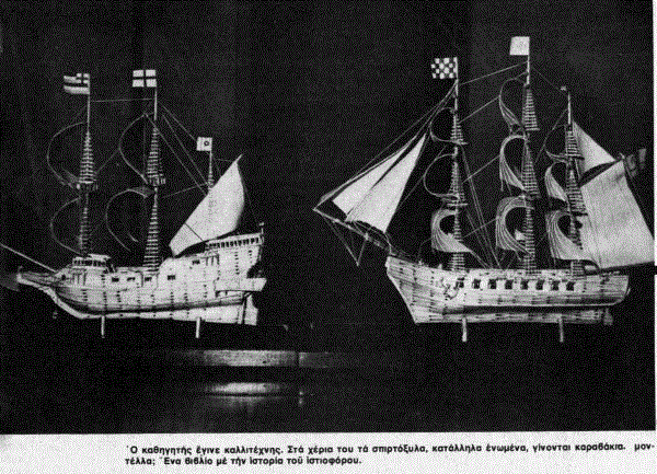 Είχαμε μοντέλα. Λόγου χάριν, είχα προμηθευτεί με τη βοήθεια της γυναίκας μου ένα βιβλίο με την ιστορία του ιστιοφόρου. Απ’ αυτό καθόριζα τα ακριβή μέτρα των πλοίων που έφτιαχνα.