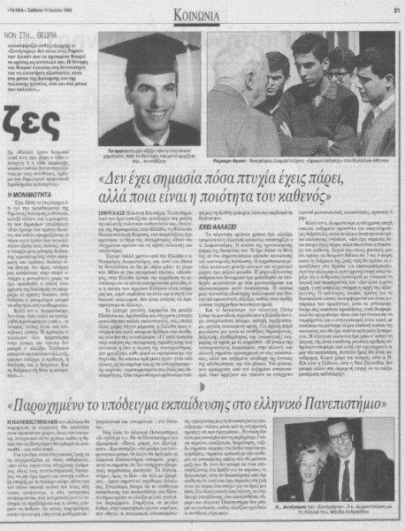 Πώς είναι το ελληνικό πανεπιστήμιο; «Σε σχέση με τι;» Με τα πανεπιστήμια του εξωτερικού. «Ποιας χώρας του εξωτερικού;» Και συνεχίζει: «Αν μιλάμε για τον ερευνητικό κόσμο, θα έλεγα ότι πράγματι τα ελληνικά πανεπιστήμια υστερούν, χωρίς αυτό να σημαίνει ότι δεν υπάρχουν εξαιρετικές περιπτώσεις φοιτητών. Τα πανεπιστήμια όμως τα ίδια —και πάλι με εξαιρέσεις— έχουν σημαντικά περιθώρια βελτίωσης. Γενικότερα, θεωρώ ότι το υπόδειγμα εκπαίδευσης που ακολουθείται στα πανεπιστήμια πρέπει να αλλάξει ριζικά, γιατί είναι παρωχημένο. Στηρίζεται, σε μεγάλο βαθμό, στην αποστήθιση ολίγων κειμένων, που οδηγεί σε πνευματική αυτοαπομόνωση, αφαιρώντας μας τη δυνατότητα να αποκτήσουμε γνώσεις μέσα από τη συγκριτική προσέγγιση των πραγμάτων. Η γνώση δεν είναι μια κονσέρβα που τη σερβίρουμε. Γνώση σημαίνει αναζήτηση, διερεύνηση, ταξίδι, σημαίνει να μπεις στα βαθιά νερά να κολυμπήσεις, σημαίνει εμπλοκή με την επιθυμία να αποκομίσεις οφέλη που θα μείνουν μαζί σου. Κι αυτό δεν μπορεί να γίνει αποστηθίζοντας ένα βράδυ για να περάσεις το διαγωνισμό, ούτε αν διακατέχεσαι από την αίσθηση ότι αυτό που έχει σημασία στη ζωή είναι να πάρεις ένα πτυχίο για να βρεις μια θέση. Για όλους αυτούς τους λόγους, το υπόδειγμα εκπαίδευσης που ακολουθείται σήμερα στο ελληνικό πανεπιστήμιο δεν μπορεί να επιβιώσει, καθώς αλλάζουν ραγδαία οι συνθήκες γύρω μας».