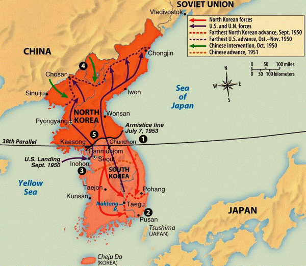 Ένα εξ αυτών ήταν η Κορεατική χερσόνησος, η οποία, μετά την ήττα της Ιαπωνίας στο Β’ Παγκόσμιο Πόλεμο, είχε χωριστεί σε δύο ζώνες με όριο τον περίφημο 38ο Παράλληλο (δηλαδή, τον 38ο παράλληλο κύκλο βορείως του Ισημερινού): στη βόρεια, που τελούσε υπό τον έλεγχο των Σοβιετικών και των Κινέζων, και στη νότια, όπου είχαν αναπτυχθεί αμερικανικά στρατεύματα.