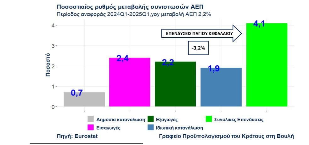 Οι προβλέψεις αυτές επηρεάζονται από την αύξηση των δασμών των ΗΠΑ κατά 10% στις εισαγωγές από την ΕΕ, την έντονη αβεβαιότητα στην εμπορική πολιτική και την πρόσφατη ανατίμηση του ευρώ, τα οποία επιβαρύνουν κυρίως τις εξαγωγές και τις επενδύσεις.